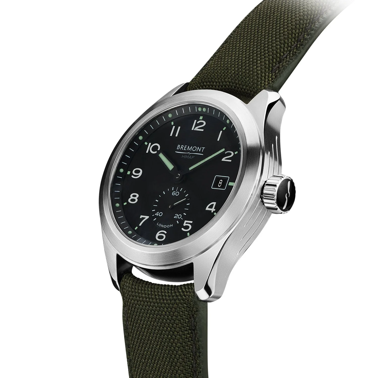 Bremont is extremely proud to be the first watch brand to sign the United Kingdom’s Armed Forces Covenant in February 2019. The Bremont Broadsword is a contemporary take on the three handed ‘Dirty Dozen’ watch design which houses the chronometer rated BE-95-2AV movement inside its two-piece 40mm hardened steel case as well as a sub-seconds hand at 6 o’clock. Multiple layers of luminous paint on the hands and dial complete the original specification for the British Army. Khaki green sailcloth strap.