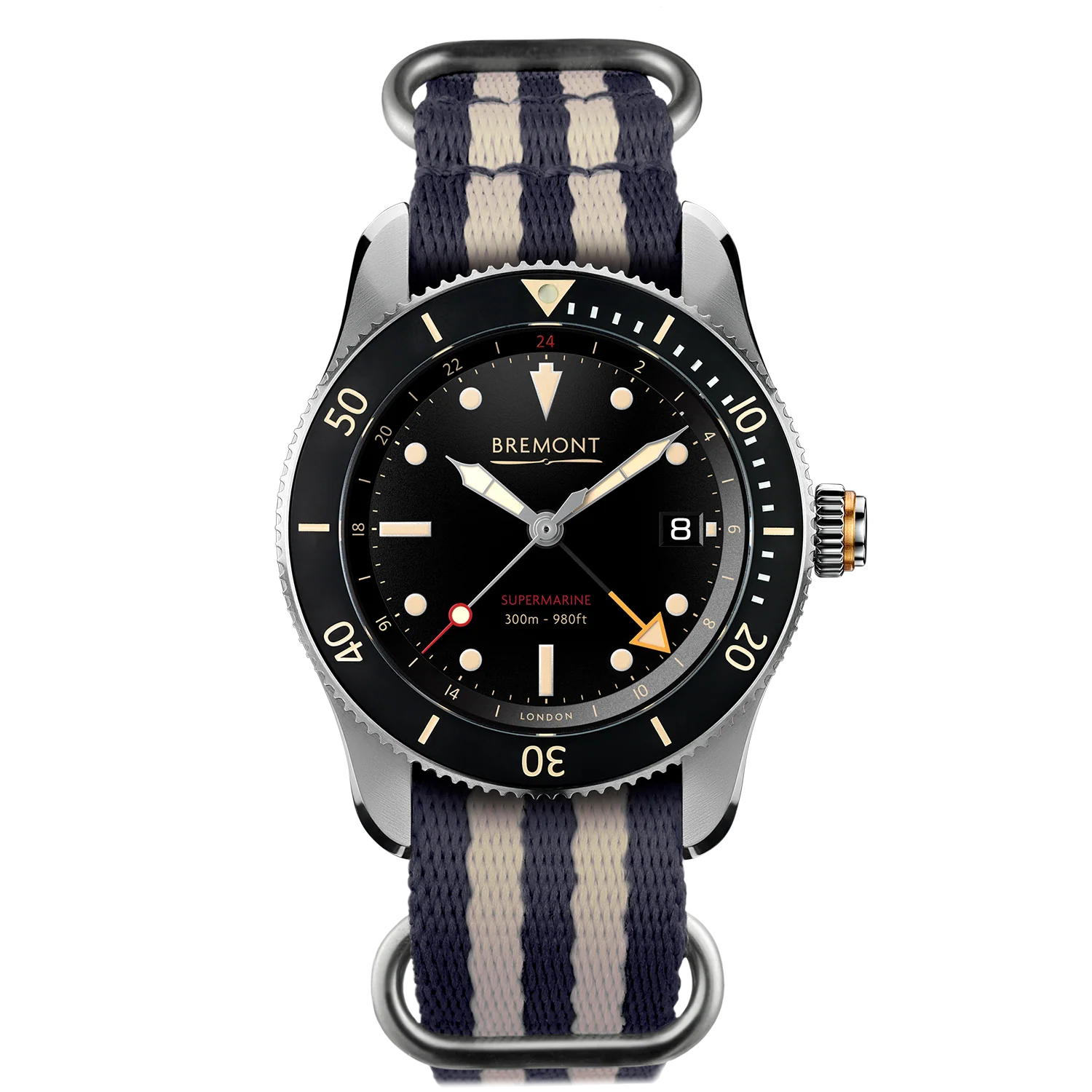 The S302 joins Bremont's Supermarine Type 300 range, a range that responded to demand for a professional device watch in a slightly smaller iteration at 40mm. The vintage aesthetic follows on from its predecessor, the S301, but with added GMT functionality. The burnt orange GMT hand beautifully complements the 24-hour markers seen around the watch's dial ring and the colour applied indexes which use the company's iconic 'P-51' Super LuminNova.