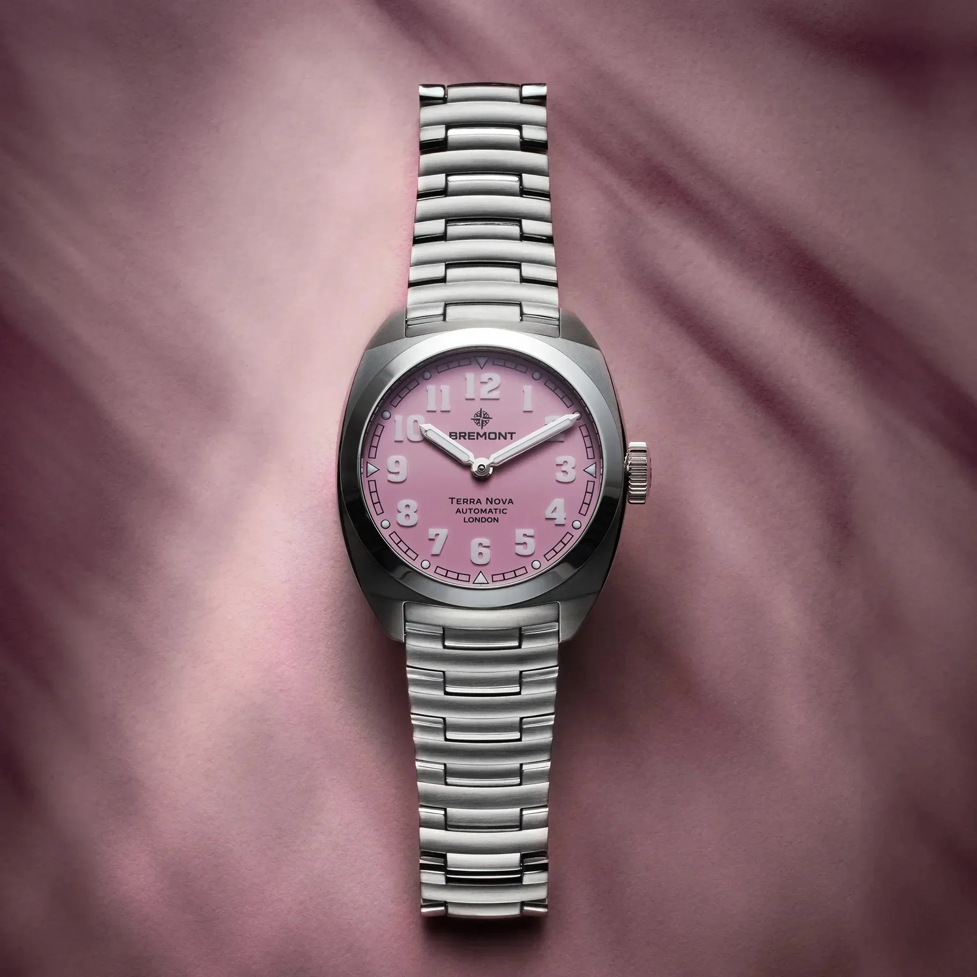 The Limited Edition Terra Nova 38 'Pink' brings bold style and practicality together. The compact 38mm 904L steel cushion case with its slim profile and tapered lugs ensures a comfortable fit on the wrist. The addition of a pink dial adds a refreshing contrast and a British sense of daring to the robust field watch design.